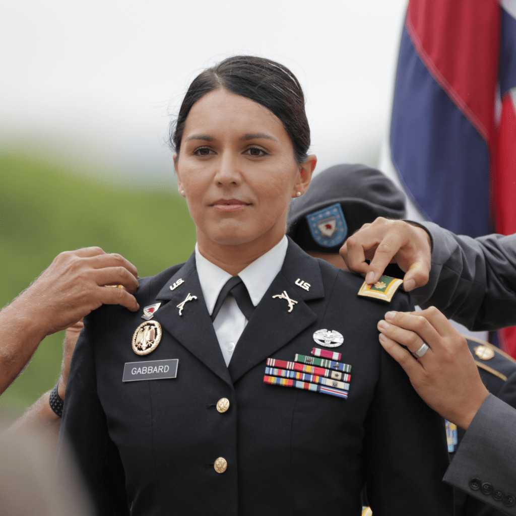 Serving in Iraq’s Balad Air Base, she quickly rose through the ranks, being awarded the Meritorious Service Medal and Combat Medical Badge during her service there. Later, she was stationed in Kuwait, where she became the first woman to receive an award of appreciation from the Kuwait National Guard. In 2015, Gabbard was promoted to the rank of major; in 2021, she was deployed to the Horn of Africa as a civil affairs officer.