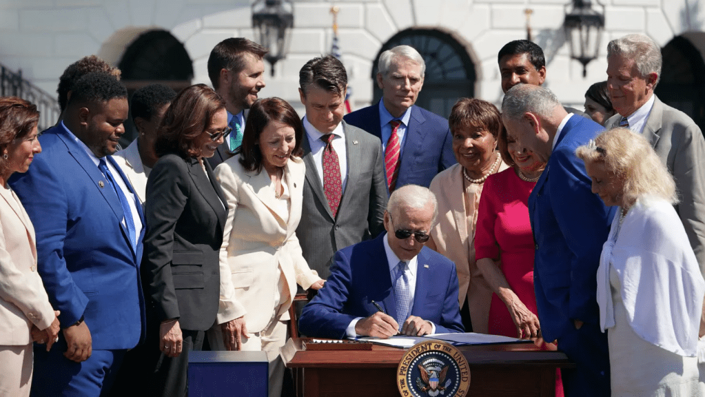 President Joe Biden signing the CHIPS and Science Act of 2022 into law on the South Lawn of the White House. Source: Getty Images