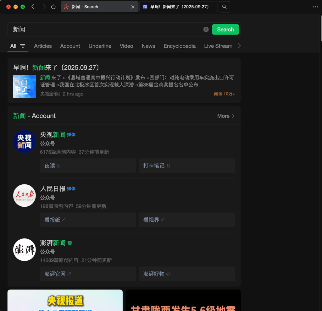Let’s try searching for “news” (新闻). Putting the result in the search bar and pressing the button, you’ll be immediately redirected to a page of results that may seem a bit unfamiliar in format.