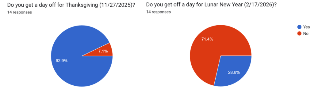 However, only four out of fourteen students had a day off for Lunar New Year, three out of fourteen for the beginning of Ramadan, and four out of fourteen for Diwali. Furthermore, seven responders stated that they either did not receive days off or their days off for cultural holidays are labeled as Professional Development/Work Days, rather than with the name as the holiday.
